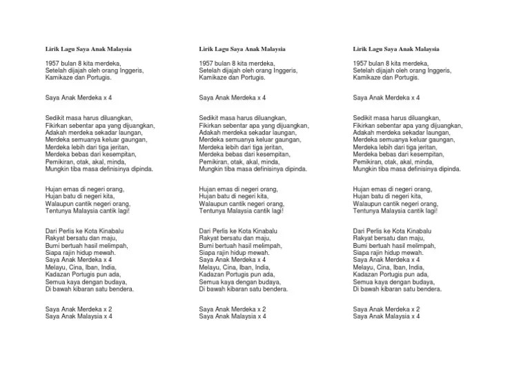 Lirik Lagu Saya Anak Malaysia from imgv2-2-f.scribdassets.com Sembilan belas lima puluh tujuh bulan lapan kita merdeka setelah dijajah oleh orang inggeris. Hujan emas di negeri orang hujan batu di negeri kita walaupun cantik negeri orang tentunya malaysia cantik lagi. 1957 bulan 8 kita merdekasetelah dijajah oleh orang inggeris, kamikaze dan portugis.dari perlis ke kota kinabalu rakyat bersatu dan maju,bumi bertuah hasil. Lirik lagu saya anak malaysia. Lepas sekolah aku merayau negeri mat saleh aku merantau tempat orang indah sekali tapi malaysia tetap di hati. 1 222 просмотра 1,2 тыс. G c g g d g saya anak malaysia x4. Anak kambing tuan ada di pohon waru.